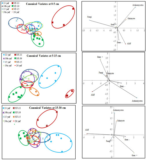 Figure 5. Canonical multivariate analysis of variance of phospholipid fatty acid biomarkers for 0–5 cm, 5–15 and 15–30 cm depths. Vectors represent standardized canonical coefficients and indicate the relative contribution of each biomarker group to each canonical variate. Soil samples were collected from 15, 26, 33, 39a, 39b yaf sites as well as non-fumigated (NF-15, NF-33 and NF-39) sites.