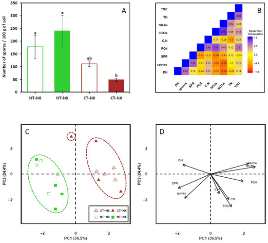 (A) Average number of spores per 100 g of soil ± standard error in each of the four treatments. Letters indicate differences among treatments according to a Conover post-hoc test (p < 0.05) following a significant Kruskal–Wallis test (p < 0.01). The filled bars correspond to the presence of nitrogen fertilization. The empty bars correspond to the absence of nitrogen fertilization. No-till is indicated in green while conventional tillage is indicated in brown. (B) Spearman correlations between measured parameters. Values of Spearman correlations are colored by blue as positive, red as negative, and yellow as neutral. Numbers in the squares are correlation coefficients. Factor map of the individuals (C) and variables (D) as obtained by principal component analysis based on spore density, dehydrogenase activity, soil penetration resistance and nutrient content. The green circle (-----) groups samples collected in no-tilled soils while brown circles (-----) group samples collected in ploughed soils. CT-N0: conventional tillage without nitrogen fertilization; CT-NX: conventional tillage with nitrogen fertilization; NT-N0: no-till without nitrogen fertilization; NT-NX: no-till with nitrogen fertilization; spores: spore density; DH: dehydrogenase activity; SPR: soil penetration resistance; NO3w: NO3−-N content measured from soil solution collected in lysimeters; NO3s: NO3−-N content extracted from soil samples; PO4: soil available phosphorus; TN: soil total nitrogen; TOC: soil total organic carbon; C:N: soil carbon/nitrogen ratio.