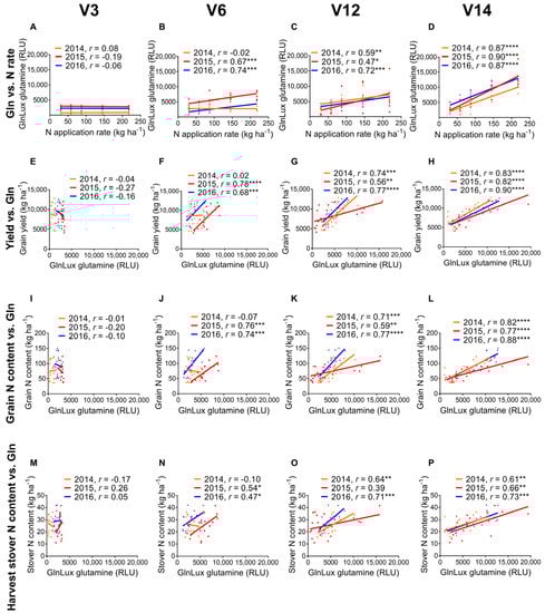 The correlation between maize leaf GlnLux glutamine and the N application rate (Figure 1A–D) generally increased as vegetative growth progressed from V3 to V14, becoming most significant at or after V6. As maize and other cereal crop species mature, N demand increases along with the metabolic needs of the growing plant influenced by environmental factors [,,,]. The results presented here indicate that the modern maize hybrid tested has a developmental threshold for applied N, such that during early development (V3), N supply at the field site exceeded the demand for N-requiring macromolecules (e.g., protein) resulting in saturation of assimilatory free Gln, even at low N application (Table 1; Figure 1A). Another possibility is that at V3, the young plant roots may have not yet reached the mid-row where fertilizer was applied. However at or after V6, plants were able to uptake and assimilate N into Gln when higher soil N was available. Previous studies have shown that on average, ~40% of total seasonal N uptake occurs between the V6 and V14 growth stages [,]. The results of this study extend known temporal dynamics of N demand to include assimilatory Gln.