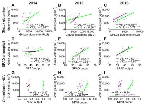 Correlation of end-season maize grain yield (kg ha−1) and (A–C) GlnLux glutamine; (D–F) SPAD; and (G–I) NDVI output. Maize was provided with N application rates of 30, 58, 87, 145, or 218 kg ha−1. All measurements were recorded at the V6 and V12 growth stages in 2014, 2015, and 2016. Asterisks represent significant Pearson correlations at p < 0.05, <0.01, <0.001, and <0.0001. RLU, relative light units intercepted by the luminometer in a one second interval.