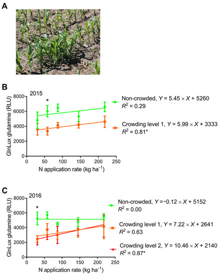 Data outliers were identified and removed with ROUT, Q = 1% []. Pearson correlation was used to compare normalized vegetative growth stage GlnLux glutamine levels (raw luminometer output—the luminometer output of a negative control consisting of 0.1% PIC in the place of tissue extract) to N application rate and end-season field measurements. Pearson correlation of SPAD chlorophyll and GreenSeekerTM NDVI with yield was also performed. GlnLux glutamine data from crowded and non-crowded sections was regressed linearly against the N application rate. F tests were used to examine if slopes deviated from zero, and if the intercepts of the equations differed significantly []. Significant differences between GlnLux glutamine levels from the crowded and non-crowded treatments within individual N application rates were tested with Šidák’s multiple comparisons []. All statistical analyses were performed using GraphPad Prism 6 (GraphPad Software Inc., San Diego, CA, USA), and significance was determined at p < 0.05, 0.01, 0.001, or 0.0001 as indicated.