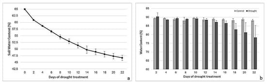 The SWC of the control group was maintained at 65% by regular watering. To apply drought stress, irrigation was stopped five days after sowing (DAS). In these pots, the SWC decreased (p < 0.01) from 65% to 46.7% at the end of drought (22 days; Figure 1a). During the first 12 days of drought treatment, the LWC did not decrease and stayed at about 88%, as in control plants. After that time point, the LWC of drought-stressed plants decreased (p < 0.05) and was 11% less than in control plants after 22 days of drought stress (Figure 1b). Under well-watered control conditions, changes in the LWC were not significant.