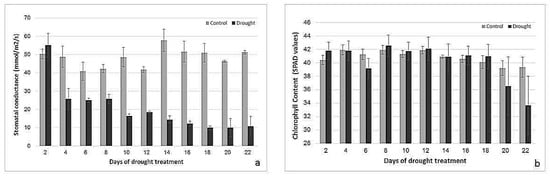 Changes in stomatal conductance (mmol/m2/s) (a) and relative chlorophyll content (SPAD chlorophyll meter values) (b) of control and drought-stressed plants. n = 3, error bars represent standard error.