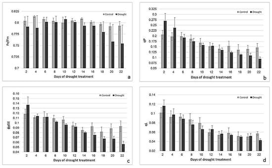 Changes in Fv/Fm (a), ΦPSII (b), qP (c), and qL (d) of control and drought-stressed plants. n = 3, error bars represent standard error.