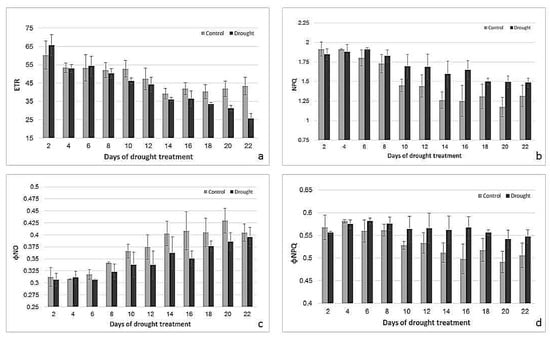 Changes in ETR (a), NPQ (b), ΦNO (c), and ΦNPQ (d) of control and drought-stressed plants. n = 3, error bars represent standard error.