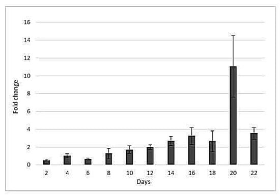 The expression of HSP17 gene was monitored for 22 days and normalized against ACTIN gene. Progressive drought affected (p < 0.005) HSP17 gene expression. The expression of HSP17 increased two- and three-fold at the 12th and 14th days of drought, respectively (Figure 5). ACTIN and PP2A had stable Ct values around 24–25 at all time-points. BM9, a MADS box gene, and the retrotransposon CEREBA primer pairs could not cross the threshold. In other words, the expression of BM9 and CEREBA genes could not be detected.