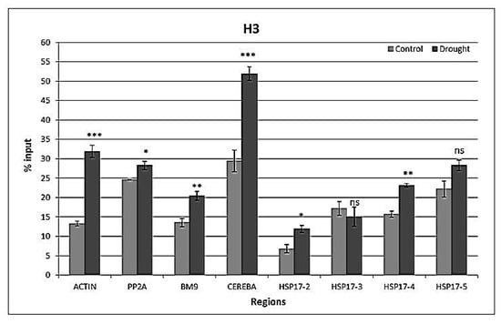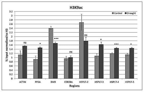 H3K9ac histone marks at reference genes ACTIN, PP2A, BM9, CEREBA as well as at the front, middle, and end of the coding region and 3′UTR of HSP17 gene. Values are expressed as %, and input is normalized to H3. n = 3, error bars represent standard error. ns: non-significant at p = 0.05 level, *: p ≤ 0.05, **: p ≤ 0.01, ***: p ≤ 0.005.