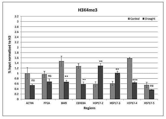 H3K4me3 histone marks at reference genes ACTIN, PP2A, BM9, CEREBA as well as at the front, middle, and end of the coding region and 3′UTR of HSP17 gene. Values are expressed as %, and input is normalized to H3. n = 3, error bars represent standard error. ns: non-significant at p = 0.05 level, *: p ≤ 0.05, **: p ≤ 0.01, ***: p ≤ 0.005.