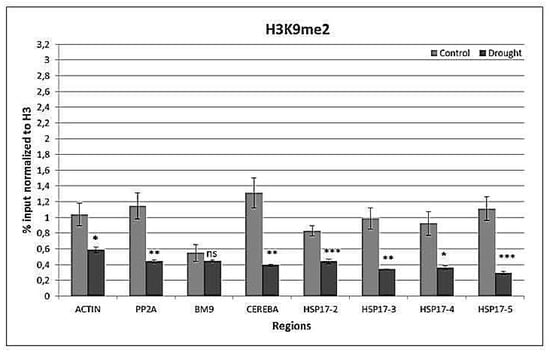 H3K9me2 histone marks at reference genes ACTIN, PP2A, BM9, CEREBA as well as at the front, middle, and end of the coding region and 3′UTR of HSP17 gene. Values are expressed as %, and input is normalized to H3. n = 3, error bars represent standard error. ns: non-significant at p = 0.05 level, *: p ≤ 0.05, **: p ≤ 0.01, ***: p ≤ 0.005.