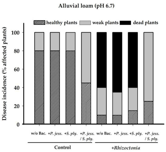 Two bacterial strains, Pseudomonas jessenii RU47 and Serratia plymuthica 3Re-4-18 [32], characterized for good biocontrol effects against bottom rot disease in previous experiments [6,21], were selected as biocontrol strains used for pre-inoculation of the lettuce plants. On the DS soil with the weakest plant development even in the controls without pathogen inoculation (Table 1), and with the most severe bottom rot symptoms, no protective effects of the bacterial inoculants against R. solani were recorded. In contrast, on the AL soil, particularly pre-inoculation with P. jessenii RU47 tended to increase biomass production of R. solani-affected plants (Figure 1). However, the most pronounced biocontrol effect was evaluated by a double-inoculation with both bacterial strains where, in contrast to the other treatments, all plants survived (Figure 2). The increased expression of antagonistic effects after double inoculation with different biocontrol strains has been similarly reported in previous studies [33] and may be attributed to additive effects of different antibiotics, cellulolytic enzymes, and induction of plant defense responses, but also to a broader activity spectrum under different environmental conditions [34]. By contrast, no additional beneficial effects of pre-inoculation with the bacterial inoculants were observed on the least conductive LL soil (Supplementary Figure S1) where the lettuce plants did not show any visible symptoms of bottom rot disease.