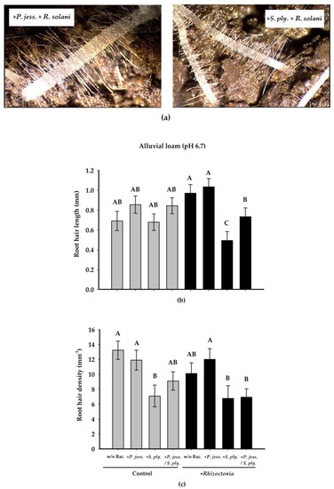 The following materials are available online at www.mdpi.com/2073-4395/7/2/44/s1. Figure S1. Shoot dry mass of Lactuca sativa L. cv. Tizian. The plants were grown on loess loam without bacterial inoculation (w/o Bac.), pre-inoculated with Pseudomonas jessenii RU47 (+P. jess.), Serratia plymuthica 3Re-4-18 (+S. ply.), a combination of both (+P. jess/S. ply.), with and without (Control) subsequent inoculation with Rhizoctonia solani AG1-IB (+Rhizoctonia). Means ± SE of four independent replicates. Figure S2. Root hair length (mm) of Lactuca sativa L. cv. Tizian. The plants were grown on loess loam without bacterial inoculation (w/o Bac.), pre-inoculated with Pseudomonas jessenii RU47 (+P. jess.), Serratia plymuthica 3Re-4-18 (+S. ply.), a combination of both (+P. jess/S. ply.), with and without (Control) subsequent inoculation with Rhizoctonia solani AG1-IB (+Rhizoctonia). Means ± SE of four independent replicates. Figure S3. Micronutrient concentration of Zn (a) and Mn (b) in shoots (mg kg−1 DM) of Lactuca sativa L. cv. Tizian. The plants were grown on loess loam without bacterial inoculation (w/o Bac.), pre-inoculated with Pseudomonas jessenii RU47 (+P. jess.), Serratia plymuthica 3Re-4-18 (+S. ply.) a combination of both (+P. jess/S. ply.) with and without (Control) subsequent inoculation with Rhizoctonia solani AG1-IB (+Rhizoctonia). Means ± SE of four independent replicates. Figure S4. Symptoms of micronutrient deficiencies (Zn, Mn, Fe) in Lactuca sativa L. cv. Tizian grown in a hydroponic culture system with controlled supply of mineral nutrients: 2 mM Ca (NO3)2, 0.25 mM KH2PO4, 0.7 mM K2SO4, 0.1 mM KCl, 0.5 mM MgSO4, 80 μM/10 µM Fe-EDTA, 10 μM H3BO3, 0.5 μM/0.1 µM ZnSO4, 0.5 µM/0.1 µM MnSO4, 0.2 µM CuSO4 and 0.01 μM (NH4)6Mo7O24.