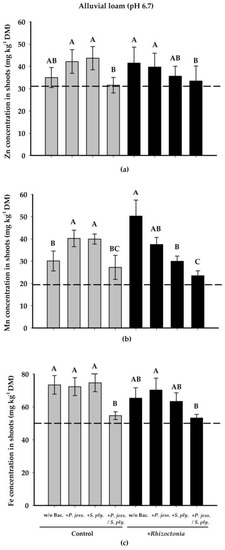 For the macronutrients N, P, K, and Mg supplied to the soils as fertilizers in sufficient amounts prior to plant cultivation, no significant treatment effects or characteristic deficiency symptoms were recorded for the lettuce plants grown on the AL and the LL soil (not shown). However, on AL soil, micronutrient shoot concentrations of Zn, Mn, and Fe (Figure 4a–c) of the treatments with R. solani inoculation showed a trend of decline in the order w/o Bac. > P. jessenii > S. plymuthica > P. jessenii +S. plymuthica, finally reaching critical values close to the deficiency thresholds [27] for the double-inoculation. In the control treatment without R. solani inoculation, this effect was restricted to lettuce plants with double-inoculation with P. jessenii and S. plymuthica (+P. jess./S. ply.).