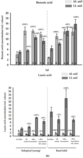 On the AL soil, R. solani inoculation resulted in a 60% reduction in shoot biomass (Table 1) and 40% of the plants finally survived (Figure 2). In contrast, no apparent bottom rot symptoms were detected on the LL soil (Table 1) and supported the observed results of higher soil suppressiveness in the field experiment [3], reflected also by the lowest infection potential on the non-inoculated control soils [3]. Accordingly, on the AL soil, pathogen inoculation significantly increased the concentrations of benzoic and lauric acids (Table 2, Figure 5) in the rhizosphere soil solutions (234% to ca. 900%), previously identified as root exudates of lettuce with documented antifungal activity against Rhizoctonia, Fusarium, and other pathogenic fungi [24,25]. In contrast, only a non-significant trend for increased root exudation of the antifungal compounds by a maximum of 30% was detected in the rhizosphere on the LL soil with antifungal suppressive potential (Table 2; Figure 5). These findings suggest that the release of the antifungal root exudates is part of the pathogen defense response in lettuce, as previously reported also for Fusarium-resistant peanut cultivars [30]. Rhizoctoniasolani-affected plants on the AL soil obviously responded with increased exudation of antibiotic compounds, while only a weak response was triggered in the R. solani inoculated plants grown on the LL soil with low R. solani infection potential.