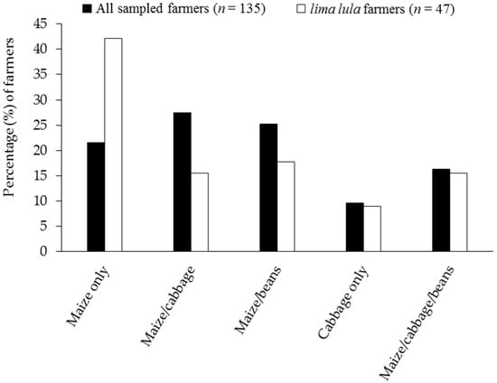 Frequencies (%) of crops and crop combinations grown by the entire sample of smallholder (n = 135) and lima lula (n = 47) farmers of the Eastern Cape Province.