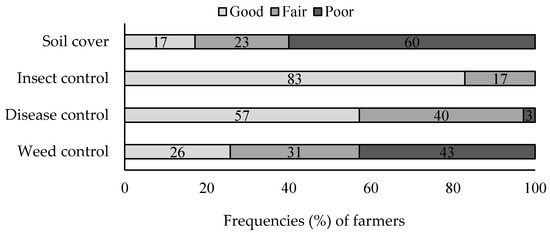 The majority of the fields lacked soil cover (Figure 2). Weed control was a challenge for the farmers, particularly in fields lacking organic mulch. However, disease and insect pest control was above average and most farmers agreed that these were not much of a problem in their fields.