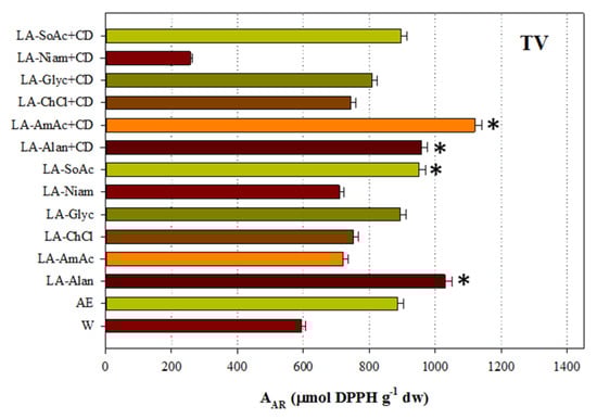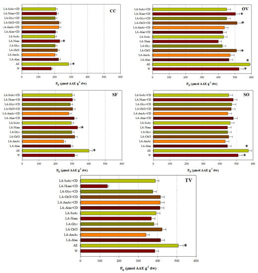 Two representative and complementary tests were carried out to assess the antioxidant activity of all the extracts generated. With the exception of SF extracts, significantly higher AAR levels were determined for those obtained with LA-AmAc/β-CD. The same phenomenon was observed for LA-Alan/β-CD, with the exception of OV (Figure 2). This finding highlighted the importance of these extraction media in obtaining extracts with strong antiradical effects. It should also be stressed that in the cases of CC, SF and TV, LA-Alan was also very effective in providing extracts with significantly higher AAR (p < 0.05). By contrast, exceptionally high PR was displayed mainly by the extracts obtained with aqueous ethanol (Figure 3), and no consistency with AAR was found.