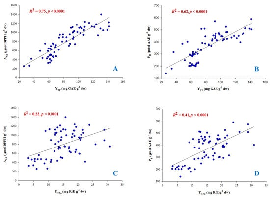 In Figure 4 it can be seen that the correlation of YTP with both PR and AAR was highly significant (p < 0.0001) and the same held true for YTFn (p < 0.0001). However, R2 was notably higher for correlations with YTP. This outcome highlighted the importance of total polyphenol concentration for the antioxidant activity of the extracts. Similar outcome was seen for various agri-food waste extracts [19], but also botanicals [13]. Nevertheless, mixture effects that can be manifested either as synergism or antagonism among the various polyphenols occurring in the extracts should also be considered. Such phenomena were demonstrated for AAR in mixtures of antioxidants [42] and mixtures of antioxidants with plant extracts [43]. Similar mixture effects for PR have also been found [44].