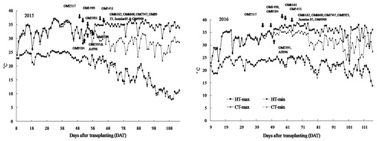 The temperature before the first cultivar’s anthesis in the control and high temperature treatment seemed to be the same in both years (Figure 1). After the first cultivars’s anthesis, the maximum temperature in the high temperature treatment group (HT) was higher than that in the control temperature group (CT) by 1.3–10.1 °C in 2015 and 0.73–10.2 °C in 2016. The temperature in HT reached peaks of 36.6 and 38.8 °C in 2015 and 2016, respectively. On cloudy and rainy days, the temperature inside HT was unable to reach 36 °C. The maximum daily temperature in HT averaged 30.0–36.6 °C in 2015 and 34.7–38.8 °C in 2016. The minimum daily temperature in HT was higher than that in CT about 0–1.0 °C in 2015 and 0–1.3 °C in 2016.