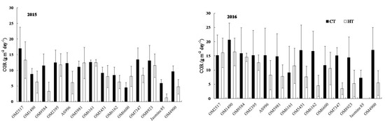 Effect of high temperature on the crop growth rate (CGR) during the ripening period in 2015 and 2016. Vertical bars indicate SD of means (n = 4).