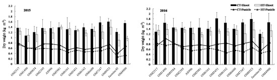 High temperature had a strong impact on the dry mass in the shoot (panicle plus straw) of almost all cultivars in both years (Figure 3). Under the high temperature conditions, the dry weight of shoots in both years decreased drastically in most cultivars, especially the late-heading ones. Among the 14 cultivars tested, the shoot dry mass of OM4900 in 2015 and OM5451 in 2016 considerably decreased under the high temperature treatment. The overall difference in dry mass between CT and HT was about 0.08–0.58 and 0.07–0.49 kg m−2 in 2015 and 2016, respectively. The dry mass of panicle reduced dramatically in most cultivars under the high temperature treatment. The dry mass of panicle in OM4900 was particularly affected, with differences between CT and HT of 0.35 and 0.33 g m−2 in 2015 and 2016, respectively.