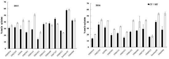 Effect of high temperature on the percentage of sterile spikelets in 2015 and 2016. Vertical bars indicate SD of means (n = 3).