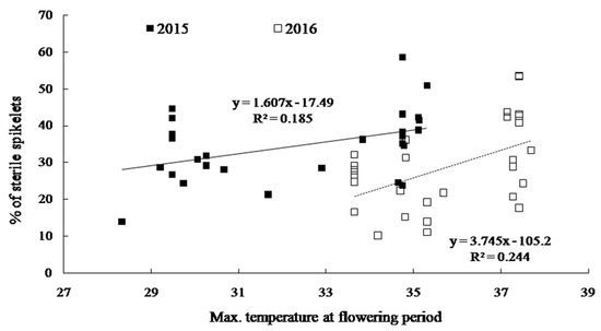 A positive correlation was observed between the percentage of sterile spikelets and the maximum temperature during the flowering period (Figure 5). The rate of correlation was higher in 2016 (R2 = 0.244) than 2015 (R2 = 0.185).