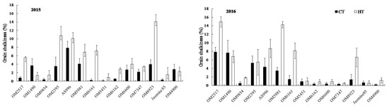 The percentage of grain chalkiness in most cultivars increased drastically in both years under the high temperature treatment (Figure 6). The difference in the percentage of grain chalkiness between CT and HT varied widely among the 14 cultivars. The percentage of grain chalkiness in HT ranged between 0.72 and 10.1% higher than CT in 2015. In 2016, the difference in grain chalkiness between HT and CT was higher, with a range between 0.1% and 10.8%. As shown in Figure 6, the largest increases in percentage of grain chalkiness under high temperatures were for OM8923 (10.1%) and OM5981 (10.8%) in 2015 and 2016, respectively. The percentage of grain chalkiness in OM2517, AS996, and OM6161 also increased markedly.