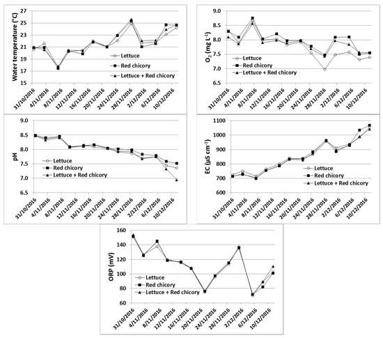 The water temperature did not show marked variation between treatments, with an average value of 21.8 ± 2.1 °C, whereas significant variations were observed during the trial (Figure 1). The pH, electric conductivity (EC), oxidation–reduction potential (ORP), O2 content and temperature were not influenced (ANOVA, p > 0.05) by the treatments (Figure 1). In regards to NH4+–N and NO2−–N, on average (between monitoring dates), contents in water were different among treatments, with significantly (ANOVA, p < 0.01) lower values in the system with red chicory (0.094 ± 0.038 mg L−1 and 0.107 ± 0.042 mg L−1 for NH4+–N and NO2−–N, respectively) compared to the lettuce alone, and red chicory and lettuce intercropped (which showed average contents of 0.143 ± 0.066 mg L−1 and 0.153 ± 0.073 mg L−1 mg L−1 in the water, for NH4+–N and NO2−–N, respectively).