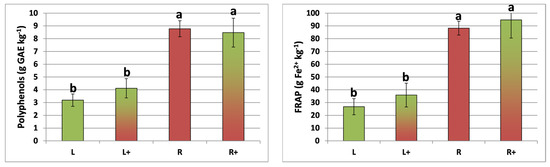 Total phenol content and antioxidant activity (FRAP) measured in lettuce and red chicory in three experimental treatments. L = lettuce; L+ = lettuce intercropped with red chicory; R = red chicory; R+ = red chicory intercropped with lettuce. Different letters (a, b) indicate significant differences (p < 0.01) among treatments for each parameter, according to the Tukey’s HSD test.