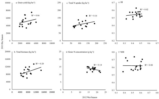 Correlations between key yield and nitrogen parameters Grain yield (a), total N uptake (b), HI (c), Total biomass (d), Grain N concentration (e) and NHI (f) across the 2012 wet season and the 2013 dry season.