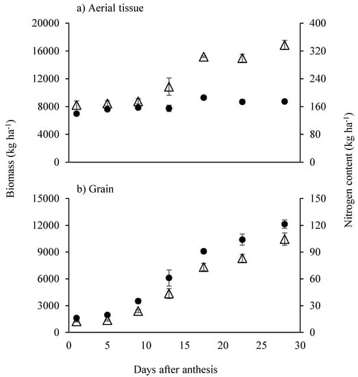 Accumulation of biomass (open triangles) and nitrogen (closed circles) in (a) aerial tissue and (b) grain of rice cv. IR64 grown under optimum conditions. Error bars represent SEM (n = 3).