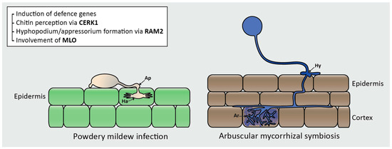 One apparent overlap between the host-requirements of AMF and biotrophic fungi is the acquisition of lipids. AMF are lipid auxotrophs, and accordingly, lipids are transferred from the host plant to AMF to sustain AM colonization [126,127,128], which requires action of the glycerol-3-phosphate acyltransferase enzyme Required for Arbuscular Mycorrhization 2 (RAM2) [129]. Jiang et al. (2017) showed that plant fatty acids are also transferred to the powdery mildew pathogen, Golovinomyces cichoracerum (DC.) V.P. Heluta, suggesting that AMF and G. cichoracerum similarly recruit the fatty acid biosynthesis program to facilitate host colonization/invasion (Figure 2) [91]. Mutations in RAM2 result in decreased levels of AM colonization associated with reduced hyphopodium formation [35,130]. RAM2 has also been shown to be required for appressorium formation by the pathogen, Phytophthora palmivora [35]. Wang et al. (2012) suggest that P. palmivora has hijacked the preexisting AM-symbiotic signaling pathway to manipulate their host metabolism, via RAM2 and the production of cutin to promote appressorium formation [35]. However, these findings have been contested [131] and the biological relevance is uncertain since the pathogen/host combination studied (P. palmivora-M. truncatula) does not occur naturally. Gobbato et al. (2013) have shown that RAM2 is required during infection by root pathogen, A. euteiches [92]. However, in this case, there does not seem to be a trade-off with AM-colonization and A. eutiches infection; previous studies have shown AM-colonized plants to be more resistant to A. euteiches, or no correlation between AM colonization and A. euteiches infection [132].