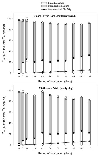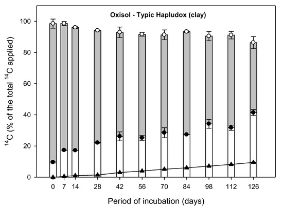 Mass balances were calculated for 14C-aminocyclopyrachlor (mineralization, extractable residues, and residues bound to soil) averaged for the eleven sampling dates (0 to 126 days) (Figure 1). Recovery of 14C ranged from 93.4% to 99.1%, 90.0% to 100.2%, and 95.4% to 99.3% in the Typic Hapludox (loamy sand), Petric Plinthosol (sandy clay), and Typic Hapludox (clay) samples, respectively. These values are indicative of good mass recoveries for the procedures used in this study, according to OECD guidelines [21], which recommend an acceptable mass balance of radioactivity to be between 90% and 110%.
