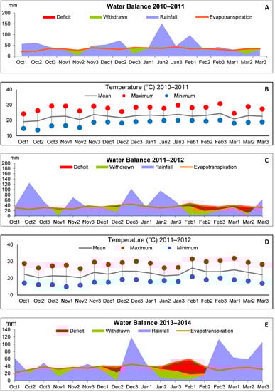 Experiments were completed in the 2010–2011, 2011–2012, and 2013–2014 crop seasons at an experimental station belonging to the Brazilian Agricultural Research Corporation (Embrapa Soja), located in Londrina, Paraná (PR), Brazil (23°11′37″ S, 51°11′03″ W; 630 m altitude). The soil was classified as dystrophic Red Latosol (Oxisol), with 71% clay. The local annual average temperature was 21 °C, with higher averages in February (28.5 °C) and lower averages in July (13.3 °C). The annual rainfall was around 1600 mm over 123 days, concentrated mainly between January and March. This region has a Cfa climate according to the Köppen climate classification, which is described as a humid subtropical climate with hot summers. Temperature, relative air humidity, and rainfall were monitored through a weather station located in the experimental area. Rainfall and temperature data were used to calculate the water balance, according to Thornthwaite and Mather [14]. Rainfall data were those corresponding to the entrance of rain into the system; the entrance of water by irrigation was also included. Air temperature data were used to calculate the potential evapotranspiration, which depends on climate factors.