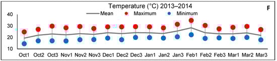 Water balance (WB) calculated according to Thornthwaite and Mather [15] and mean temperature (T°) for 10-day periods (1, 2, 3) over three crop seasons in Londrina, PR, Brazil. (A). WB 2010/2011; (B). T° 2010/2011; (C). WB 2011/2012; (D). T° 2011/2012; (E). WB.2013/2014; (F). T° 2013/2014.
