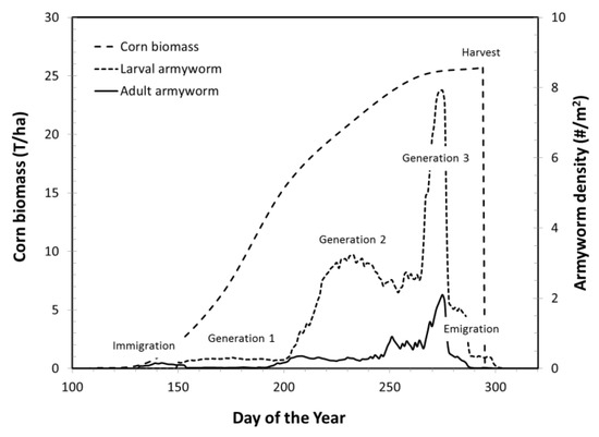 In a typical model run, the crop biomass increased during the spring and summer and was harvested in September or October; crop biomass is shown without crop loss to pests. This simulation is of armyworm on corn in Wayne County, Ohio in 2011. Armyworm adults immigrated in May, and developed three generations before adults entered reproductive diapause in August and emigrated. Yield loss was calculated at harvest based on the magnitude and timing of the larval population density.