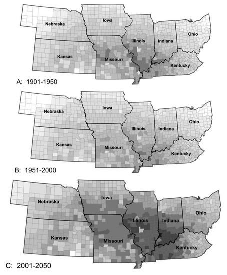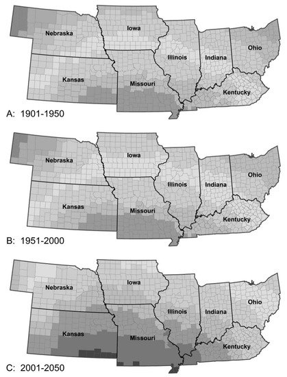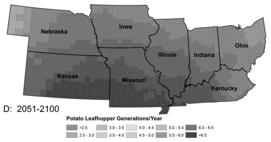 Analyses of the likely effects of climate change have all attempted to assess impact at a regional and in a few cases global, scale. These estimates have been derived from two approaches: point estimates scaled up to the desired region and spatially-explicit computations using mapping to display the results. Our approach is slightly different in that it replicates the point estimate approach at the county scale over a region comprising 813 counties. Schmitz et al. [57] suggested that “mapping approaches may paint a very conservative portrait of climate-change effects on ecosystems”. By employing climate and biological process models to generate generalized predictions, our results are conveniently presented as maps. It is likely that our mapped projections are indeed conservative but not because of the mapping approach. Our results are likely to be conservative because the well-known temperature-dependence of the rate of herbivory [58] is but one factor leading to changes in pest pressure under climate warming. An insect’s life-system will predispose its population response to climate change and those that have the most flexible life-systems are likely to take best advantage of climate warming. The maps (Figure 2, Figure 3, Figure 4, Figure 5 and Figure 6) clearly illustrate movement of the climate envelopes, implying changes in population dynamics and trophic interactions over the coming century.