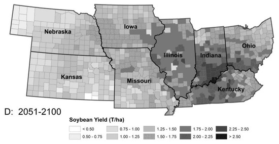 Model predictions for soybean production in the absence of pest pressure: Period 1 (A), Period 2 (B), Period 3 (C) and Period 4 (D). The model predicted increasing temperatures from Period 2 to 3 will lead to a modest increase in yield followed by a decline in the latter part of the 21st century (Period 3 to 4), resulting from heat stress and changing rainfall patterns. Note the northward movement of maximal productivity. The changes in corn productivity between periods were similar although the spatial details differed.
