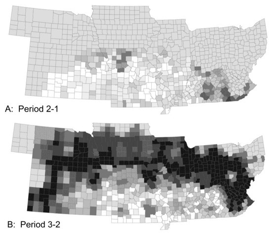 The model predicted little change in crop damage (A) by stalk borer (without insecticides) from Period 1 to 2, except for an area in Eastern Kentucky, large increases in crop damage (B) across the region from Period 2 to 3 and a small recovery (C) from Period 3 to 4. Damage by Mexican bean beetle was similar in overall pattern but differed in detail.