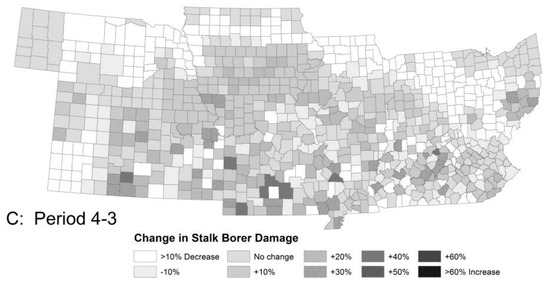 Stalk borer is currently a moderately serious pest throughout the southern part of the region and a sporadic problem in the northern tier of counties. The model predicted little change from Period 1 to 2 and a large increase in population and damage potential in Period 3 with a smaller increase in Period 4 (Figure 3). The northern tier of counties was predicted to see a doubling in population of stalk borer in Period 3 and a commensurate increase in potential crop damage. Southeastern Kansas, Southern Missouri and Kentucky could see little or no change in stalk borer damage potential. The largest increase in population was predicted for southern Iowa, northern Missouri and northeastern Kansas with damage potential increasing 60–70% from Period 2 to 3. This results from the northward movement of the area of maximal winter survival. However, overall survival across the region is expected to change little as the isoclines move north. The increase in damage potential results from the earlier onset of population growth. For this insect, the net effect for the region as a whole is likely to be small but could be locally extreme.