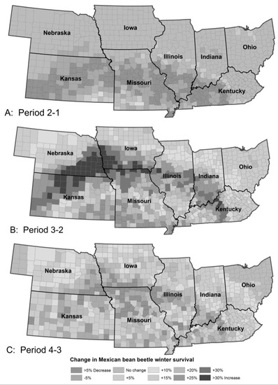 The model predicted only a small change in Mexican bean beetle population between Periods 1 and 2 in line with experience. Over the current century, the number of generations per year was predicted to increase from 2–3 to 4–5 over much of the range. This would result in substantial increases in population density over almost the entire range, except for NE Ohio and extreme NW Nebraska. The biggest increases in population were predicted for Kansas, Missouri and southern Iowa and Illinois. Unlike most of the other insects in the study, the biggest increase in population and damage potential was predicted in Period 4, not Period 3 as the beetle compensates for the higher summer temperatures. Overwinter survival is currently highest in southern Kansas, Missouri and Kentucky. By Period 3 peak overwinter survival will have moved north to central Illinois, southern Iowa and northeastern Kansas (Figure 5), which would increase the damage potential across the central part of the region.