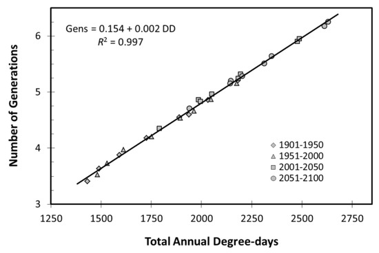 For all migrant species, the model predicts the arrival of immigrants up to two weeks earlier in Period 3 than in Period 2, resulting in at least one extra generation across the range. As a result, the model predicts a big increase in population and damage potential across the northern five states. The model predicted an increase in the number of generations per year in all species except the univoltine stalk borer. Potato leafhopper, a species with overlapping generations, is the starkest example, with the number of generations increasing only slightly in the 20th century but increasing dramatically during the 21st century (Figure 6). Its poor tolerance of high temperatures, will result in little change in pest status in Kentucky and even a slight reduction in southern Kansas and Missouri. Ohio is expected to see an increase in population and damage potential in Period 3 followed by a small decrease in period 4. The dependence of population growth on temperature is clearly evident in the relationship between number of generations and accumulated degree-days for this species (Figure 7).