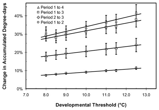 The percentage change (±standard error) in degree-day accumulations increases with developmental threshold. Both the intercept and the gradients increased when Period 1 is compared with Periods 2, 3 and 4. The largest increases in degree-day accumulations occurred in the interval Period 2–3. Data presented here are for all nine species studied, each with a different developmental threshold.