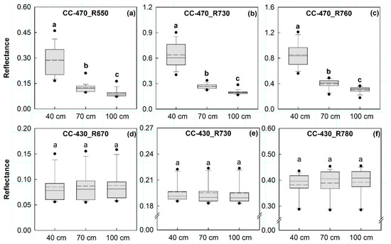 Spectral characteristics of a single wavelength obtained from Crop Circle ACS-470 (CC-470) and Crop Circle ACS-430 (CC-430) sensors at different measurement heights at the Feekes 9–10 growth stages (after canopy closure). (a) CC-470_R550, (b) CC-470_R730, (c) CC-470_R760, (d) CC-430_R670, (e) CC-430_R730, (f) CC-430_R780. The solid and dashed lines in this figure indicate median and mean, respectively. The box boundaries indicate the upper and lower quartiles (75th and 25th percentiles), the whisker caps indicate the 90th and 10th percentiles, and the circles indicate the 95th and 5th percentiles. Different letters show significant differences at p ≤ 0.05.