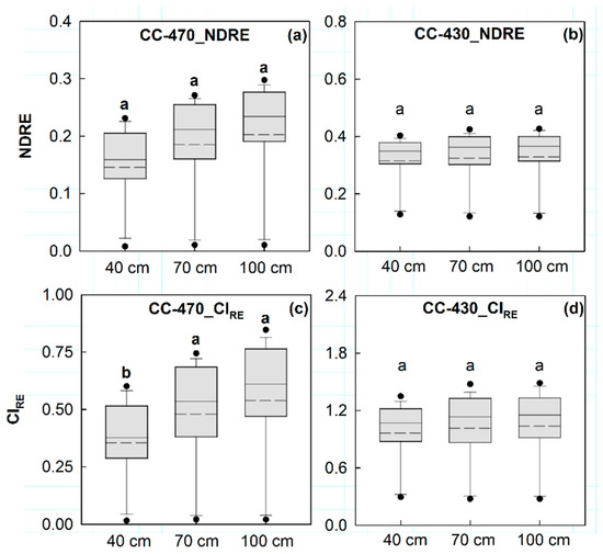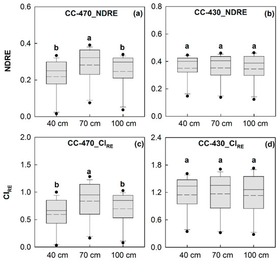 Normalized difference red edge index (NDRE) and red edge chlorophyll index (CIRE) derived from Crop Circle ACS-470 (CC-470) and Crop Circle ACS-430 (CC-430) at different measurement heights at the Feekes 9–10 growth stages (after canopy closure). (a) CC-470_NDRE, (b) CC-430_NDRE, (c) CC-470_CIRE, (d) CC-430_CIRE. Solid and dashed lines in this figure indicate median and mean, respectively. The box boundaries indicate the upper and lower quartiles (75th and 25th percentiles), the whisker caps indicate the 90th and 10th percentiles, and the circles indicate the 95th and 5th percentiles. Different letters show significant differences at p ≤ 0.05.