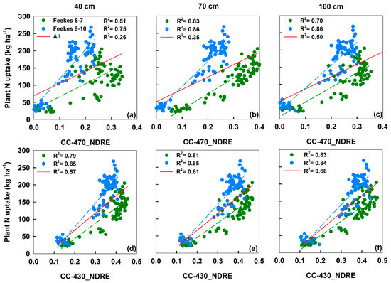 Relationships between plant N uptake and the normalized difference red edge index (NDRE) of Crop Circle ACS-470 (CC-470_NDRE) measured at 40 cm (a), 70 cm (b) and 100 cm (c) above the winter wheat canopy; and the relationships between plant N uptake and the NDRE of Crop Circle ACS-430 (CC-430_NDRE) measured at 40 cm (d), 70 cm (e) and 100 cm (f) above the canopy of the winter wheat, at the Feekes 6–7 growth stages (before canopy closure), Feekes 9–10 growth stages (after canopy closure), and across all stages. The red lines indicate the relationships between vegetation indices at different measurement heights and N status indicators across growth stages.