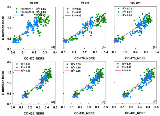 Relationships between N nutrition index (NNI) and the NDRE of Crop Circle ACS-470 (CC-470_NDRE) measured at 40 cm (a), 70 cm (b) and 100 cm (c) above the canopy of the winter wheat; and the relationships between NNI and NDRE of Crop Circle ACS-430 (CC-430_NDRE) measured at 40 cm (d), 70 cm (e) and 100 cm (f) above the canopy of the winter wheat, at the Feekes 6–7 growth stages (before canopy closure), Feekes 9–10 growth stages (after canopy closure), and across all stages. The red lines indicate the relationships between vegetation indices at different measurement heights and N status indicators across growth stages.