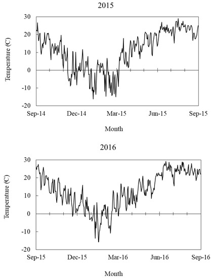 The average daily air temperature from September 1 of the planting-year to August 31 of the harvest-year for the years 2015 and 2016 is shown in Figure 2. In 2015, the temperature between late-November and early-March was below freezing point (0 °C). In 2016, freezing temperatures were only observed from early-January to mid-February. Generally, temperatures in 2015 during the months of November through March were colder compared to 2016. In addition, the temperature dropped below 10 °C earlier, and remained colder for a longer period of time compared to 2016.