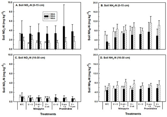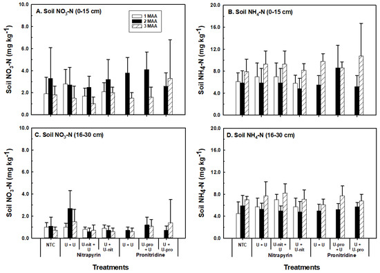 Soil test nitrate–nitrogen (NO3–N) concentration at 0–15 (A) cm and 16–30 (C) cm depths, and soil test ammonium–nitrogen (NH4–N) at 0–15 (B) cm and 16–30 (D) cm depths one, two, and three months after application (MAA) of a 40:60 split application of urea ammonium nitrate (U) totaling 79 kg N ha−1. Vertical error bars represent plus one standard deviation. Abbreviations: pro, pronitridine; nitr, nitrapyrin; NTC, non-treated control; U, urea ammonium nitrate. Application samples after one month were only taken for the non-treated control and nitrapyrin treatments.