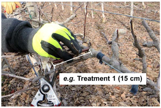While the primary goal of this study was to investigate the effect of mechanical harvesting with different pruning treatments, it is still a good model for developing automated pruning, since the proposed rules are simple and measurable. Four different treatments were applied, namely 10 cm, 15 cm, and variable twig length pruning, as well as a control set of 20 cm twig length pruning. In variable length pruning, the diameter to length ratio was set to 0.06 based on our previous study [51]. Figure 4 shows an example of cutting a twig to the length of 15 cm (reproduced from [48]).